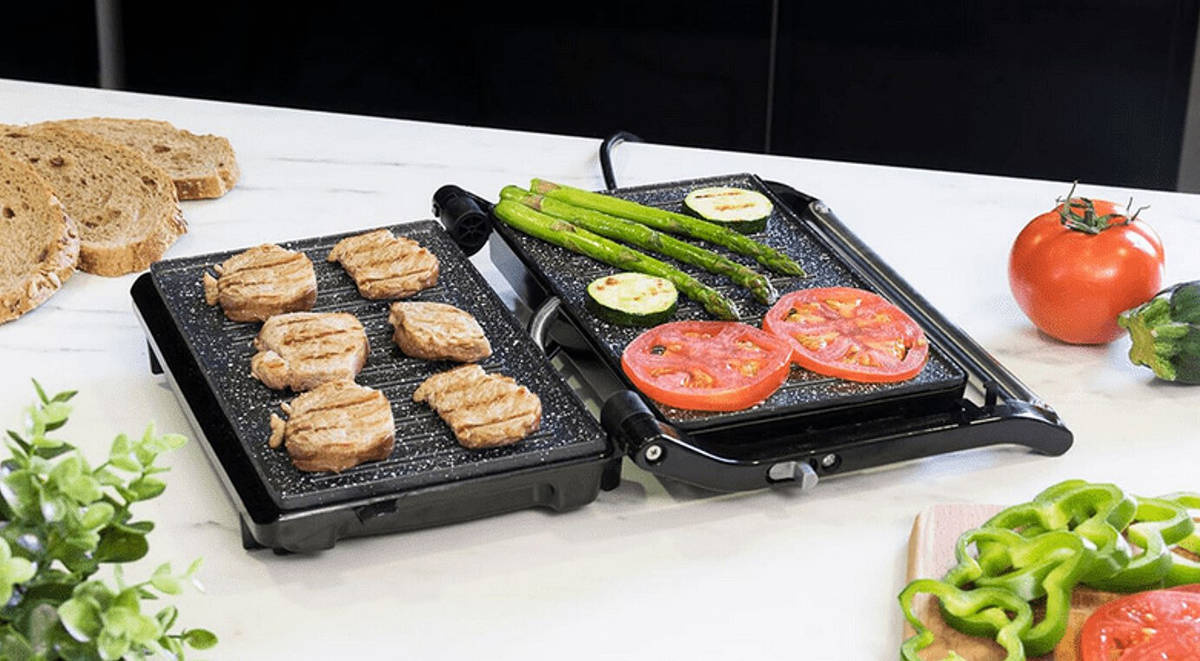 ✅ Otwarcie 180° – podwójna powierzchnia do gotowania większych porcji.