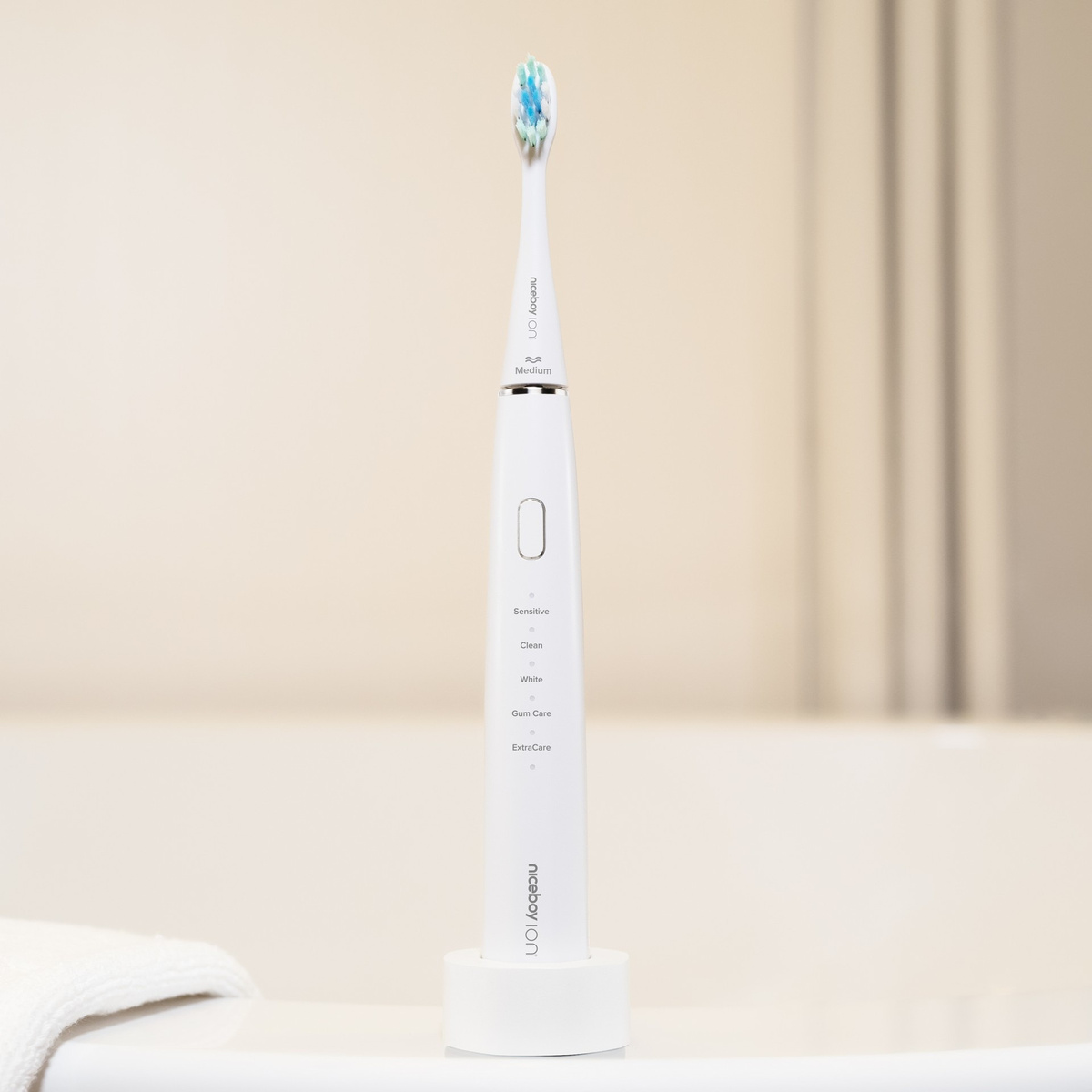 ⭐ Tryby Sensitive i Clean to standardowe programy, idealne do ogólnego, codziennego mycia, zapewniające delikatne, a zarazem skuteczne oczyszczanie. Jeśli Twoim celem jest jaśniejszy uśmiech, tryb White został zaprojektowany specjalnie do usuwania zanieczyszczeń powierzchniowych, przywracając zębom ich naturalną biel. Natomiast tryb ExtraCare to delikatniejszy program, stworzony z myślą o ochronie i masażu dziąseł, co jest kluczowe dla ich zdrowia i zapobiegania krwawieniom. Dzięki tej personalizacji, Niceboy ION Sonic zapewnia, że Twoje zęby i dziąsła otrzymują dokładnie taką pielęgnację, jakiej potrzebują, co przekłada się na optymalne rezultaty i komfort podczas każdego szczotkowania.