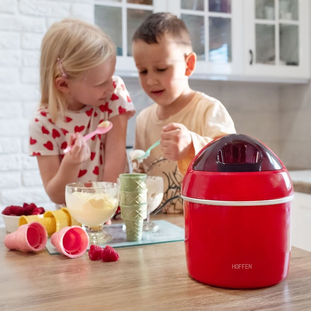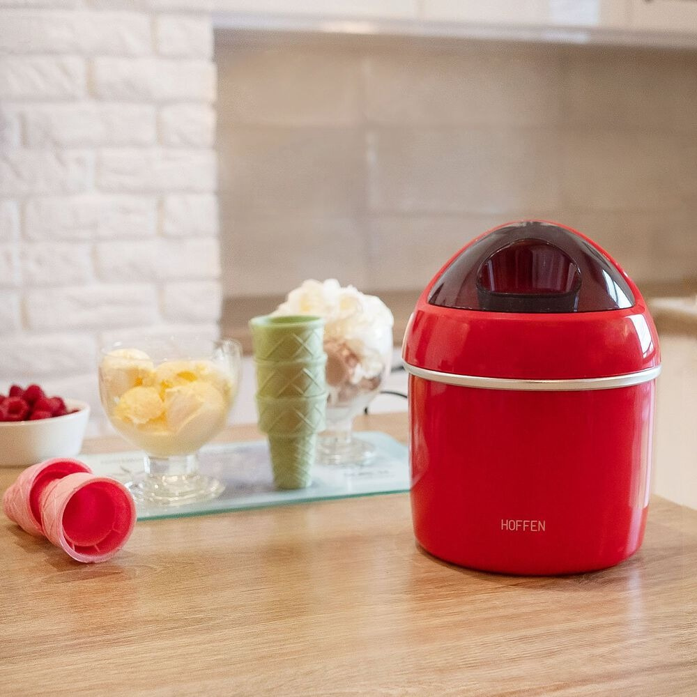 ⭐ Przygotuj lody, sorbety i mrożone jogurty w domowym zaciszu z urządzeniem HOFFEN! Stylowy, czerwony design, misa 0,8 l i mieszadło zapewnią puszystą konsystencję ulubionych deserów. Prosta obsługa, łatwe czyszczenie i zdrowa alternatywa dla sklepowych słodkości – to smak, który pokochasz!