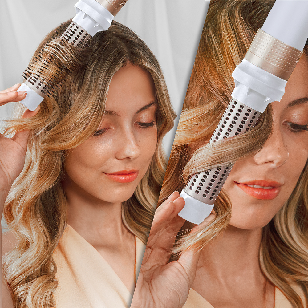 ⭐ Odkryj wszechstronność lokówko-suszarki Cecotec CeramicCare 12w1 AirGlam Champagne! Dzięki 12 wymiennym głowicom stworzysz fale, loki, gładkie pasma i objętość jak z salonu. Technologia Coanda dba o perfekcyjną stylizację bez puszenia, a powłoka ceramiczno-keratynowa chroni włosy, nadając im zdrowy blask i elastyczność.