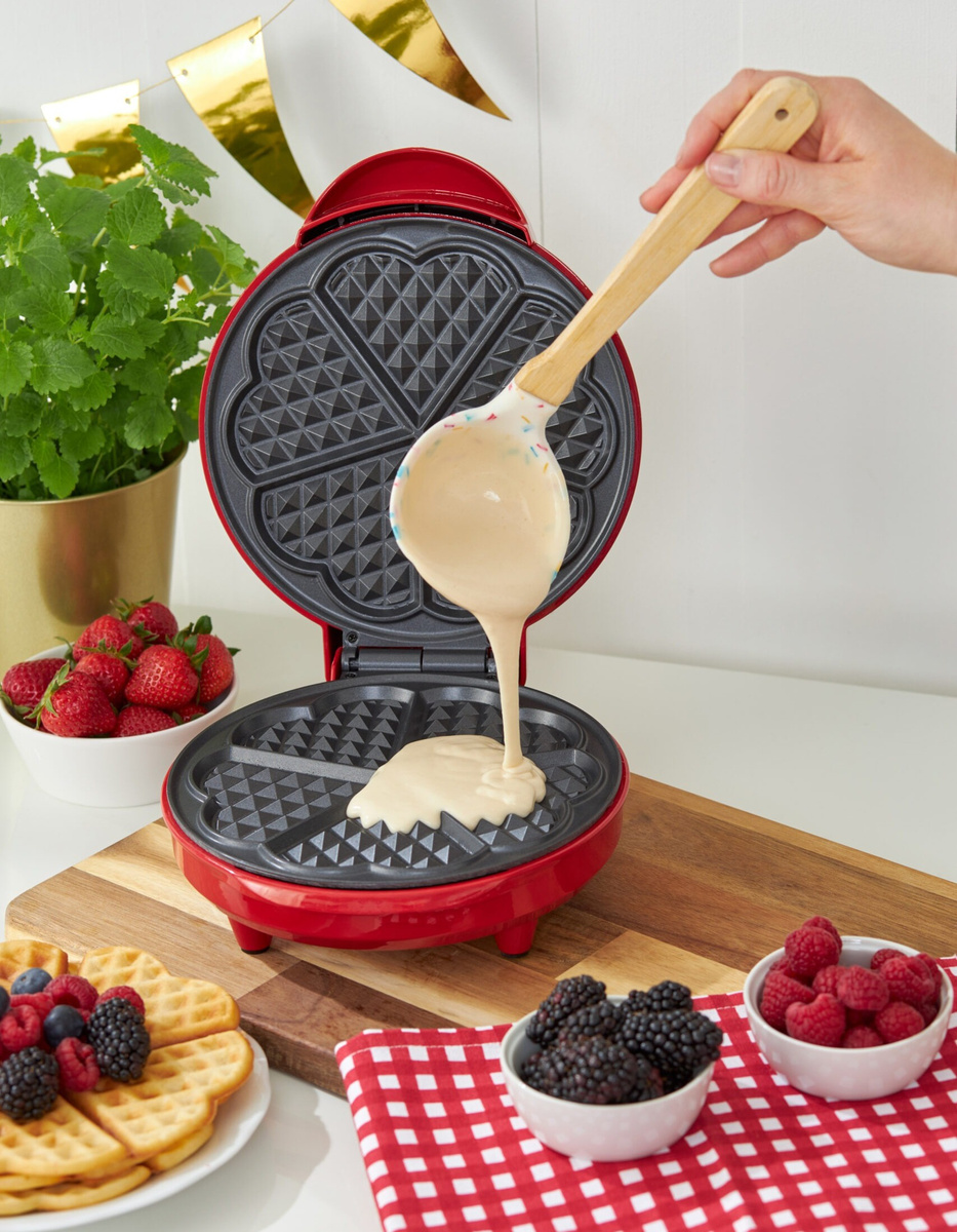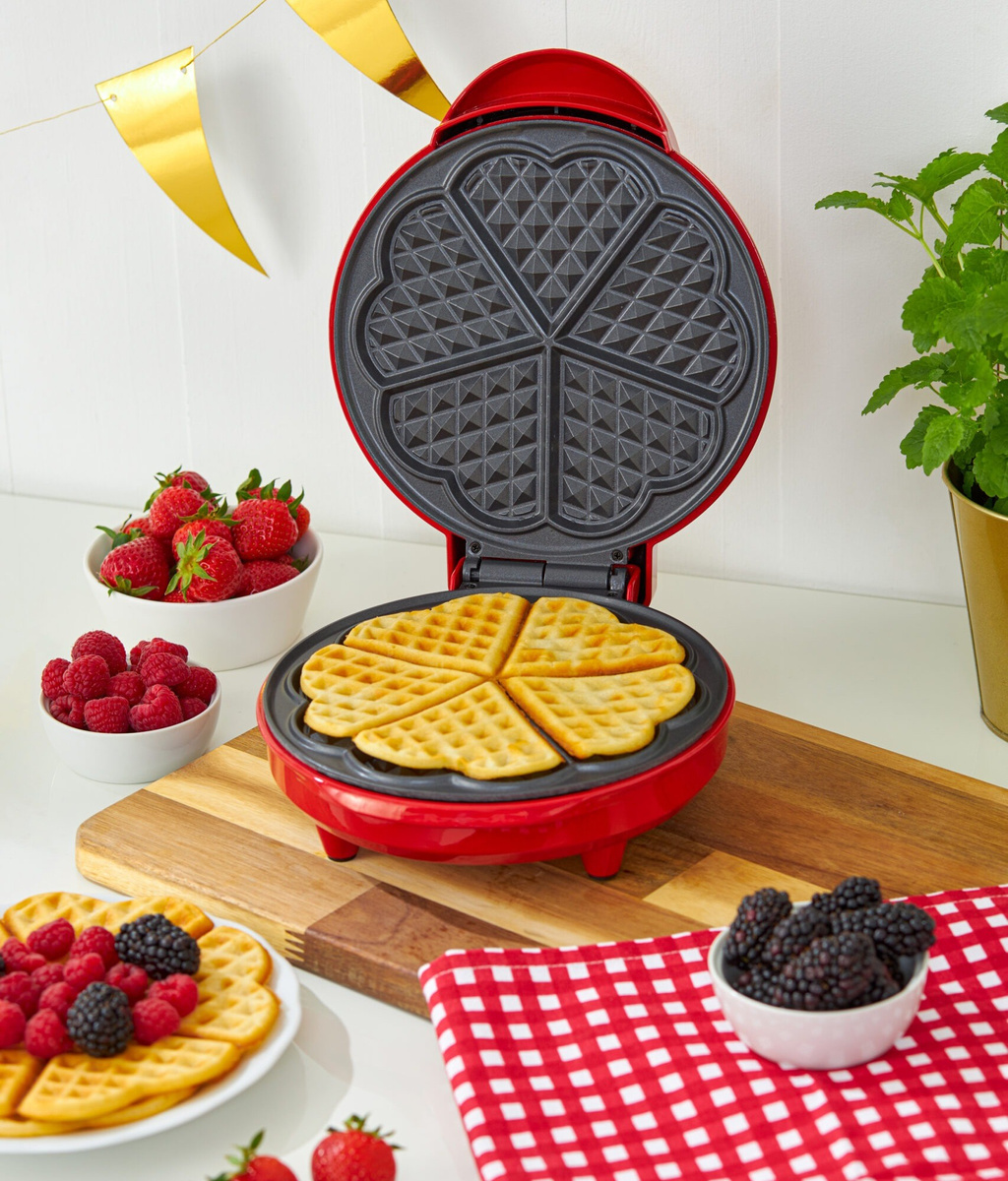 ⭐ Przygotuj złociste gofry w kształcie serca i zaskocz bliskich wyjątkowym deserem! Gofrownica Hoffen o mocy 1000 W szybko się nagrzewa, ma nieprzywierającą powłokę, antypoślizgowe nóżki i lampki kontrolne. Stylowy design i książeczka z przepisami sprawiają, że każdy dzień może być pełen pysznych i kreatywnych wypieków!